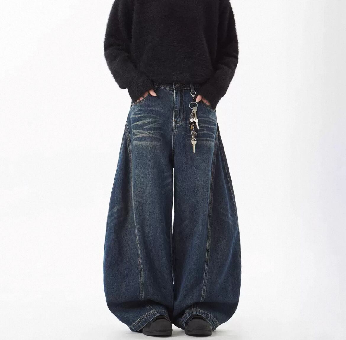 トレンド感あふれるワイドシルエットが魅力のバギーデニムパンツ。 脚のラインをしっかりと隠しつつ、抜群の存在感を放つボリュームシルエットが特徴です。 フロントに入ったフェード加工が、ヴィンテージライクな雰囲気をプラスし、どんなトップスとも相性抜群。 ウエスト部分にはキーチェーンを付けられるループがあり、アクセサリー使いも楽しめます。 スニーカー、パーカー、カーディガンなど幅広いコーデにマッチし、ユニセックスで着用可能